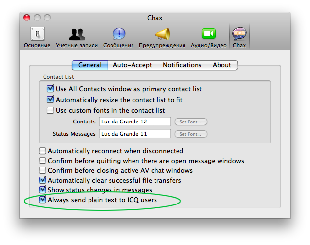 Не прошло и сто лет, как iChat, благодаря особой примочке «Chax» научился слать сообщения без HTML тегов камрадам все еще использующим ICQ.
