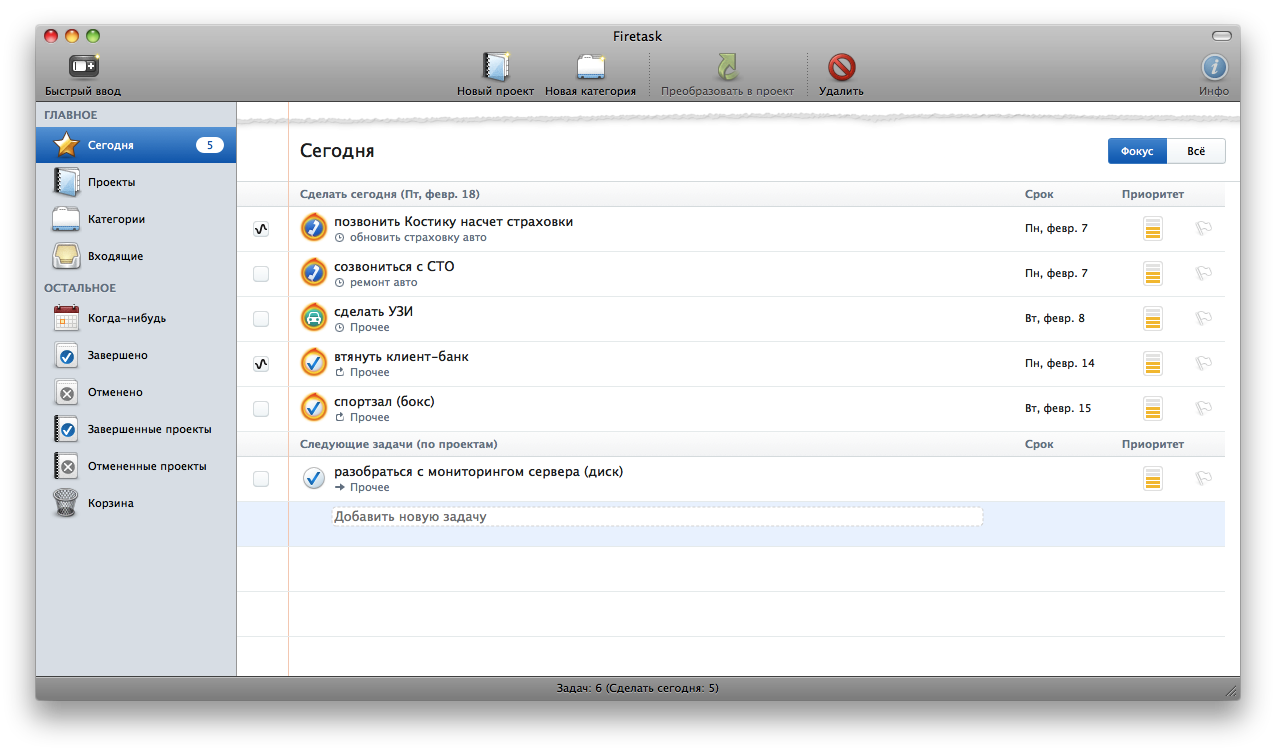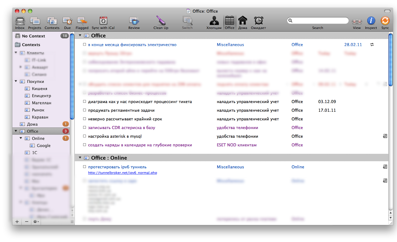 Вложенные иерархически проекты и контексты позволяют быстро сортировать связанные по смыслу проекты и задачи.