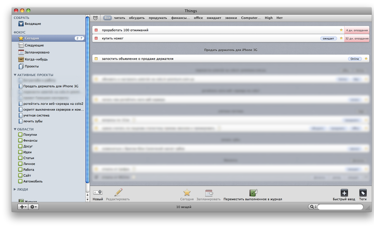 OmniFocus не смотя на кажущуюся монструозность, лишен многих недостатков Things, и в гораздо большей степени приспособлен к повседневной работе. Ниже я постараюсь отметить вещи, которые отличают OmniFocus в лучшую сторону.